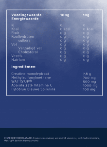 WATTS’UP® is een geconcentreerd natuurlijk ingrediënt afkomstig van citrusvruchten. Het Bevordert de kracht explosief bij conditionele training (zuurstofrijk) en krachttraining (zuurstofarm). De Acerola kers is de hoogwaardigste natuurlijke vitamine C bron afkomstig uit de Amazone en bevordert het immuunsysteem.